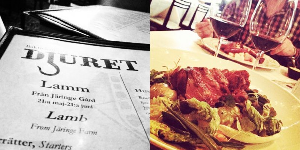 Men när man har utomsocknes finbesök i staden får man ju passa på. Därför tog jag i lördags med Tristan till Djuret i Gamla Stan. Hela poängen med Djuret är att man där serverar ett djur i taget. Hela menyn består alltid av det aktuella djurets olika styckningsdetaljer och just nu är det lamm som bjuds. En jättespännande restaurangidé tycker jag.