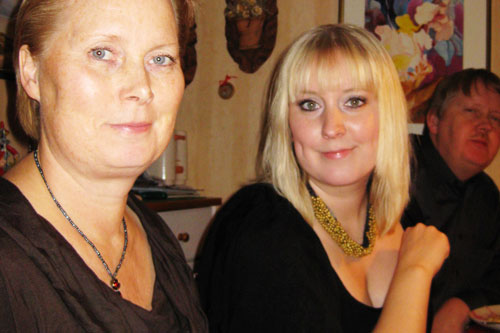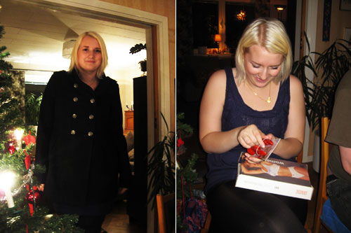 Sedan var det dags för julmat. Jag vräkte i mig kallskuret och fick sedan inte ner en enda stackars liten köttbulle. Det kan också bero på all knäck som intogs under kortspelet. Kolla våra Stepford-leenden, kan man ana släktbandet?