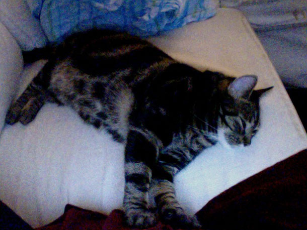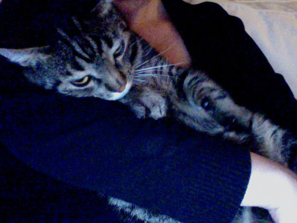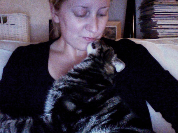 Silverkatten är hemma igen. Hon har bott hos pappa sedan förra sommaren eftersom jag varit ute och svirat jorden runt. Men nu ligger hon här bredvid mig i soffan igen och trampar in klorna i mitt lår. Lite aj ont skönt liksom. Det vill säga, när hon inte bufflar på datorn, eller handen eller vad som är närmast och vill ha kel. High maintenance, den här kattan.