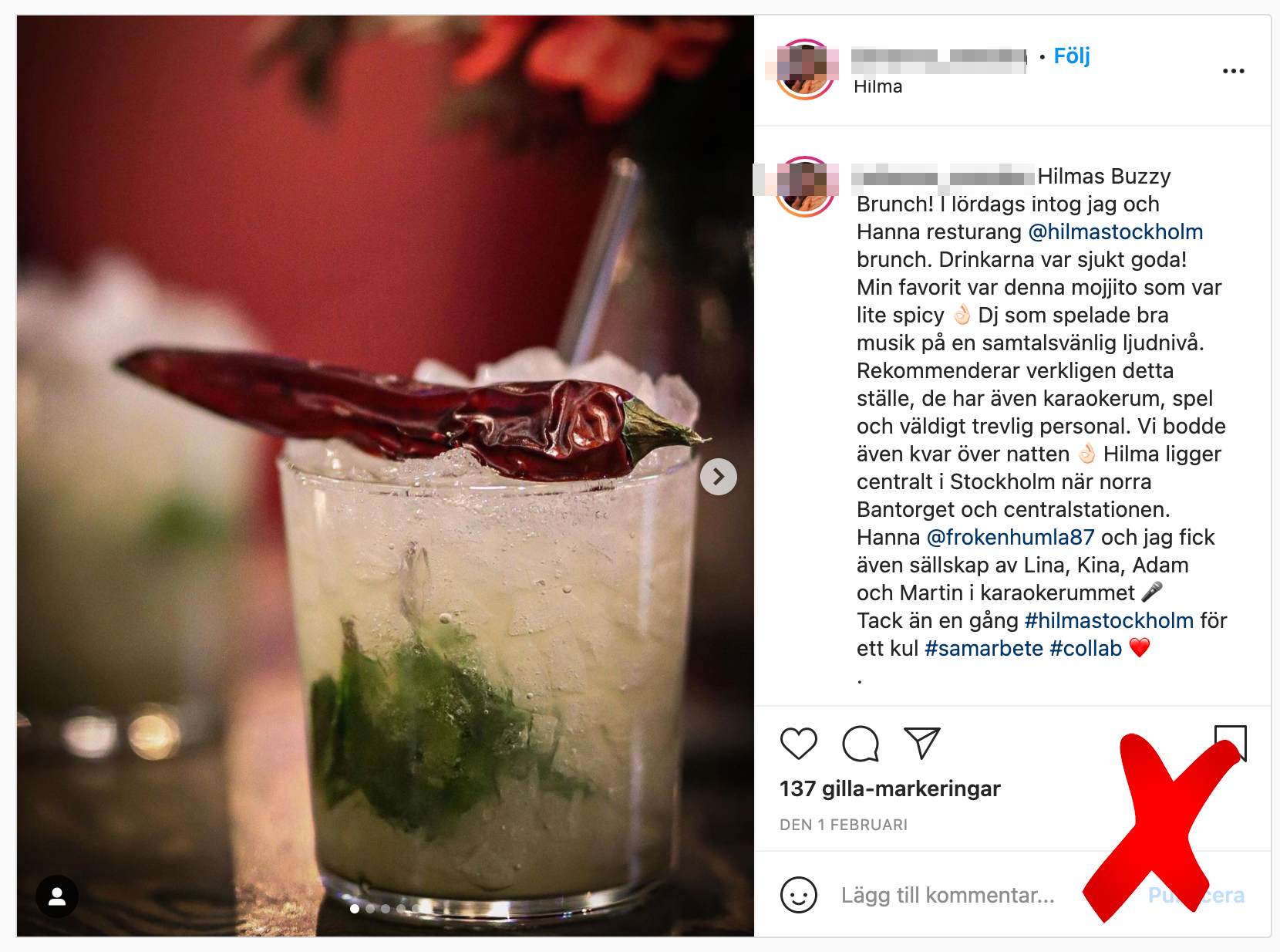 Inlägget fyller inte kraven på tydlig reklamidentifiering. Har vi inte kommit längre? SIST och #samarbete? Bakläxa.