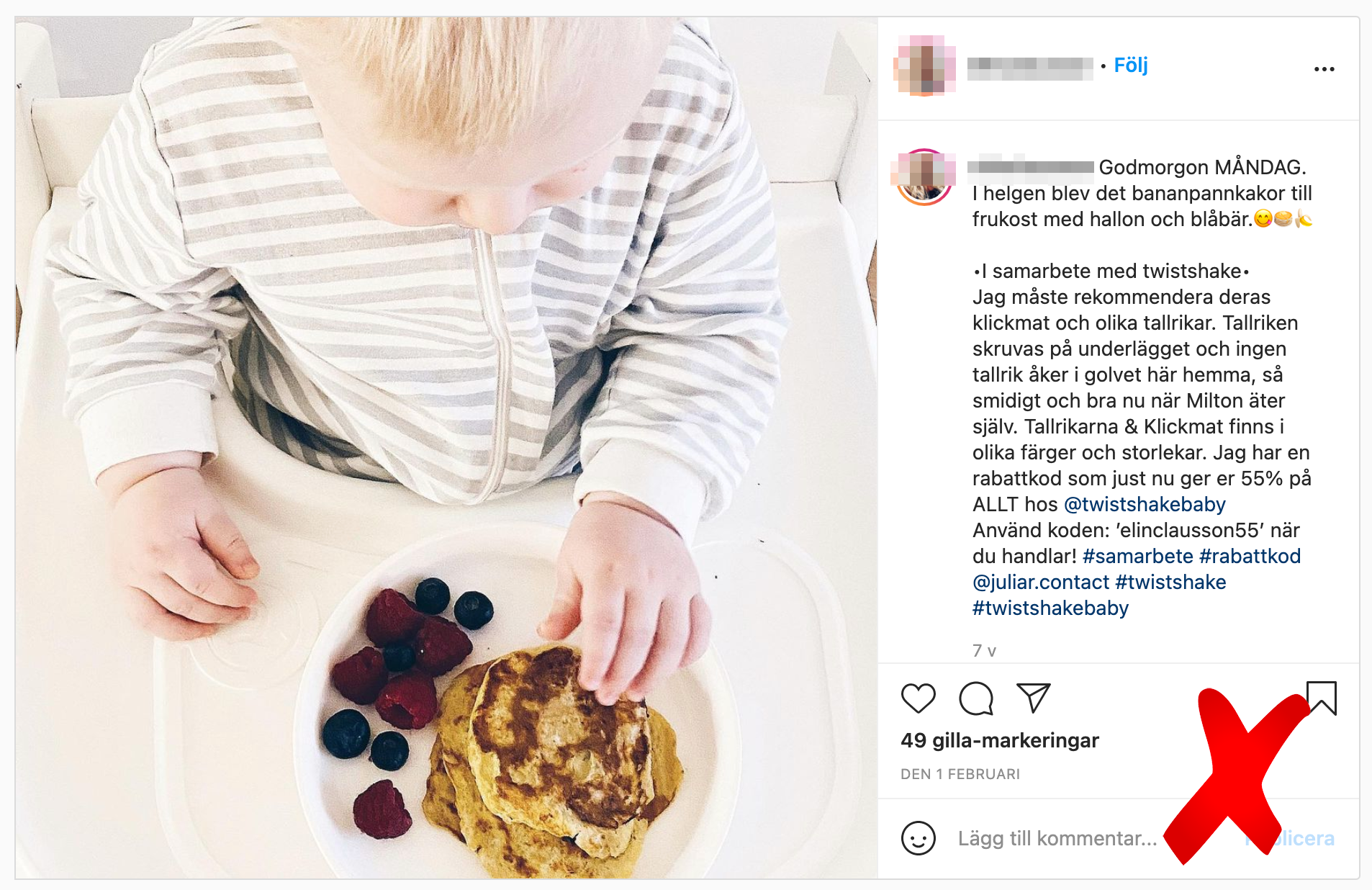 Inläggen fyller inte kraven på tydlig reklamidentifiering. Ser du dem? Om du letar lite? Nä, inte jag heller. De ligger gömda där bakom profilbilderna. Inte jättetydligt.