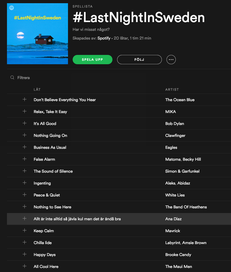Det hela resulterade i alla fall under söndagen i en kavalkad av fantastiska skämt baserat på uttalandet och nu har Spotify satt ihop en spellista på ämnet och det är typ det roligaste som hänt. Kolla låttitlarna liksom, haha!