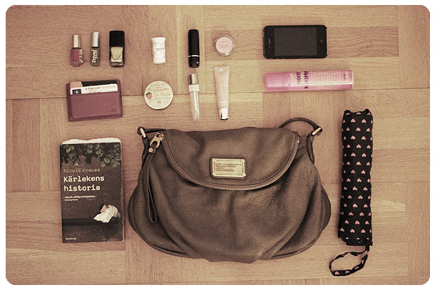 I lördags var det alltså meningen att jag skulle visa vad jag hade i min väska. Och innehållet ser nog ungefär likadant ut idag som den gjorde då. Vilket är ungefär så här (väskan är för övrigt från Marc by Marc Jacobs, inköpt i New York nu senast. Den är mjuk och lagom stor and I löv it.);