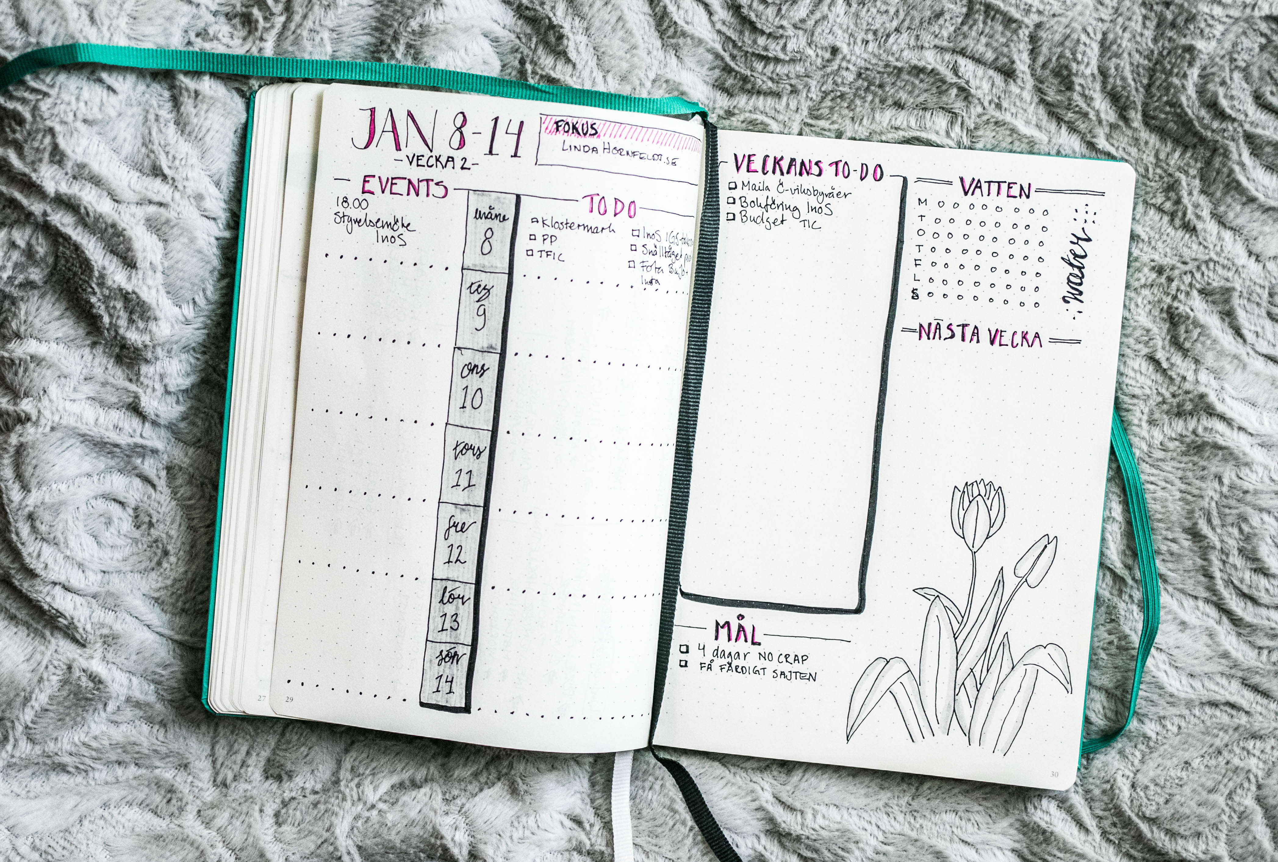 Så fint!! Älskar upplägget i weeklyn med events på ena sidan och to do på andra. Kanske borde testa något liknande! Experimenterandet är ju verkligen en av de bästa grejerna med Bujo, att man alltid kan ändra och testa något nytt. Och att man gör som man vill. Blir bättre och bättre på det. Hinner jag inte göra en weekly denna vecka? Då är det skitsamma och jag går direkt på dagens eller något annat jag behöver.