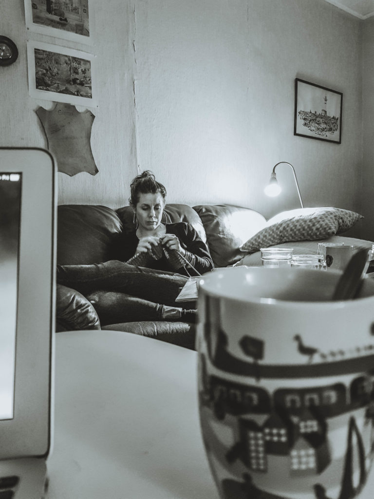 Carin stannade kvar en natt till och satt således i soffan ”backstage” och stickade medan jag körde min livesändning. Sedan satt vi så här resten av kvällen, med var sin kopp te och vårt ”handarbete”. Så jädra mysigt. <3