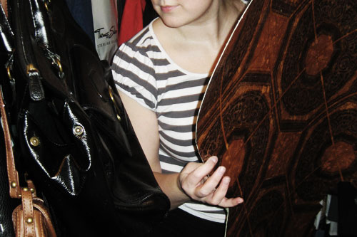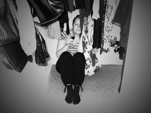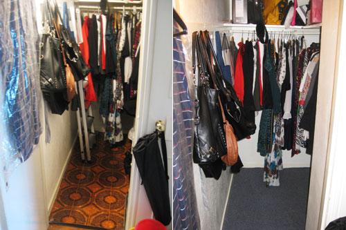 Efter några timmars hårt arbete firar jag med ett glas vin bland klänningarna.