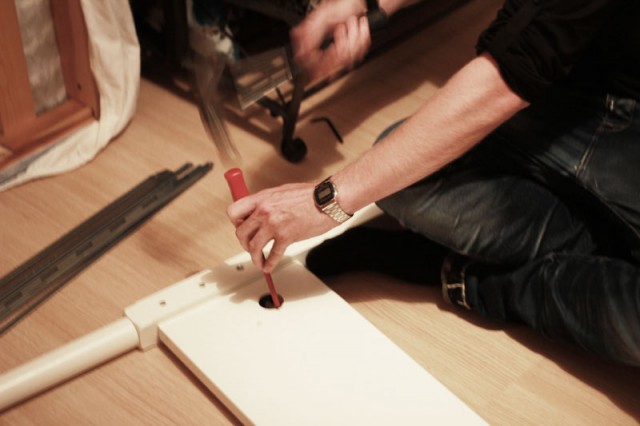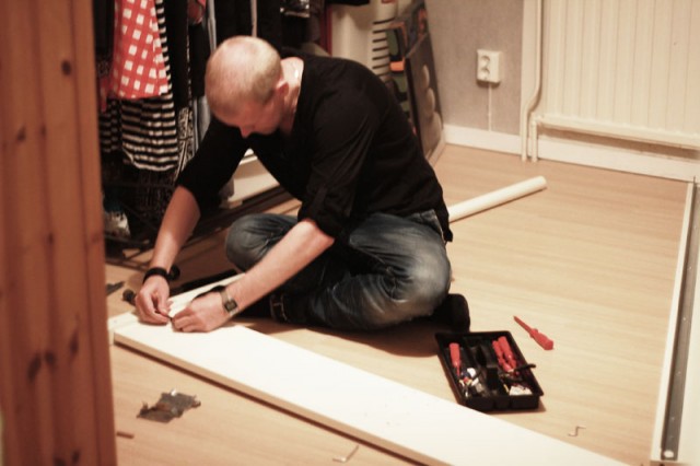 Först saknades typ hälften av skruvarna (så går det när man köper begagnat på Blocket, kom ihåg det). Sedan saknades en rätt viktig skruvmejsel som skulle in i ett hål. Och eftersom den inte fanns fick vi försöka karva upp hålet så att den skruvmejsel vi hade skulle få plats. Och när vi till slut hade skruvat ihop en gavel så insåg vi att vi hade skruvat på fel träbit på fel pinnar. Och fick göra om allt igen.