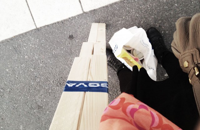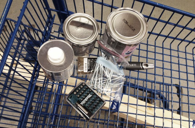 I slutändan lämnade jag med en massa träbitar, vit snickerifärg, grundfärg, olja (till mitt matbord), en drös skitlånga skruvar, en pensel (sån som man målar med) och såna där joxprylar som man stoppar i skruvdragare (i mitt fall borrmaskin, tager vad man haver och sådär) för att kunna skruva med.