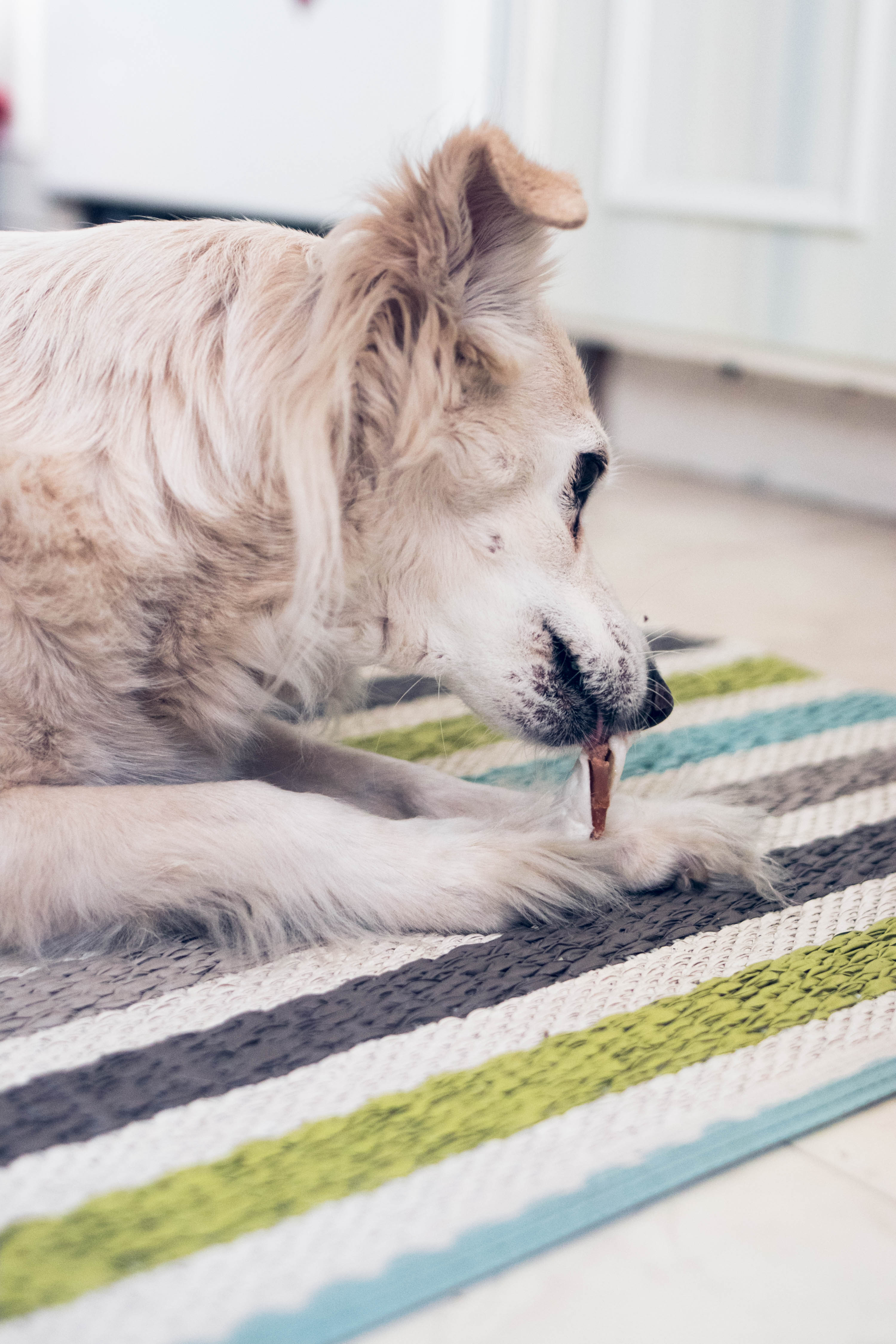Leia är loj i värmen och orkar som mest tugga på ett ben men ligger helst på svalt golv och tupplurar.