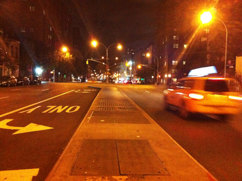 Korsningen Bowery/Houston, ca fem kvarter från mig, på väg hem någon gång strax före midnatt. Jag tycker om att glida runt i ”mina kvarter” så här på kvällskvisten och spana in de livliga restaurangerna och barerna och se var det är man ska gå för nästa drink eller middag.