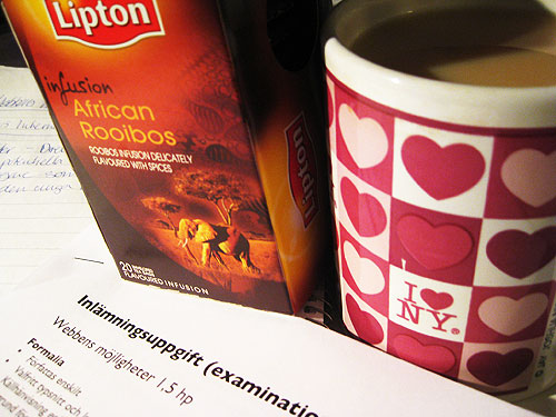 Förra helgen introducerade Jenny mig för rött te, jag har mest hållit mig till svart eller grönt, men oj vilken höjdare rött var! Mycket kryddigare och helt enkelt mer smak. Det jag drack hos Jenny var Chai Rooibos och det var supergott! Det fanns dock inte på mitt lilla Coop, så det blev en afrikansk variant istället, man tager vad man haver liksom. Och så serverat i min favoritkopp från New York-resan 2006. Schyssta bananer.