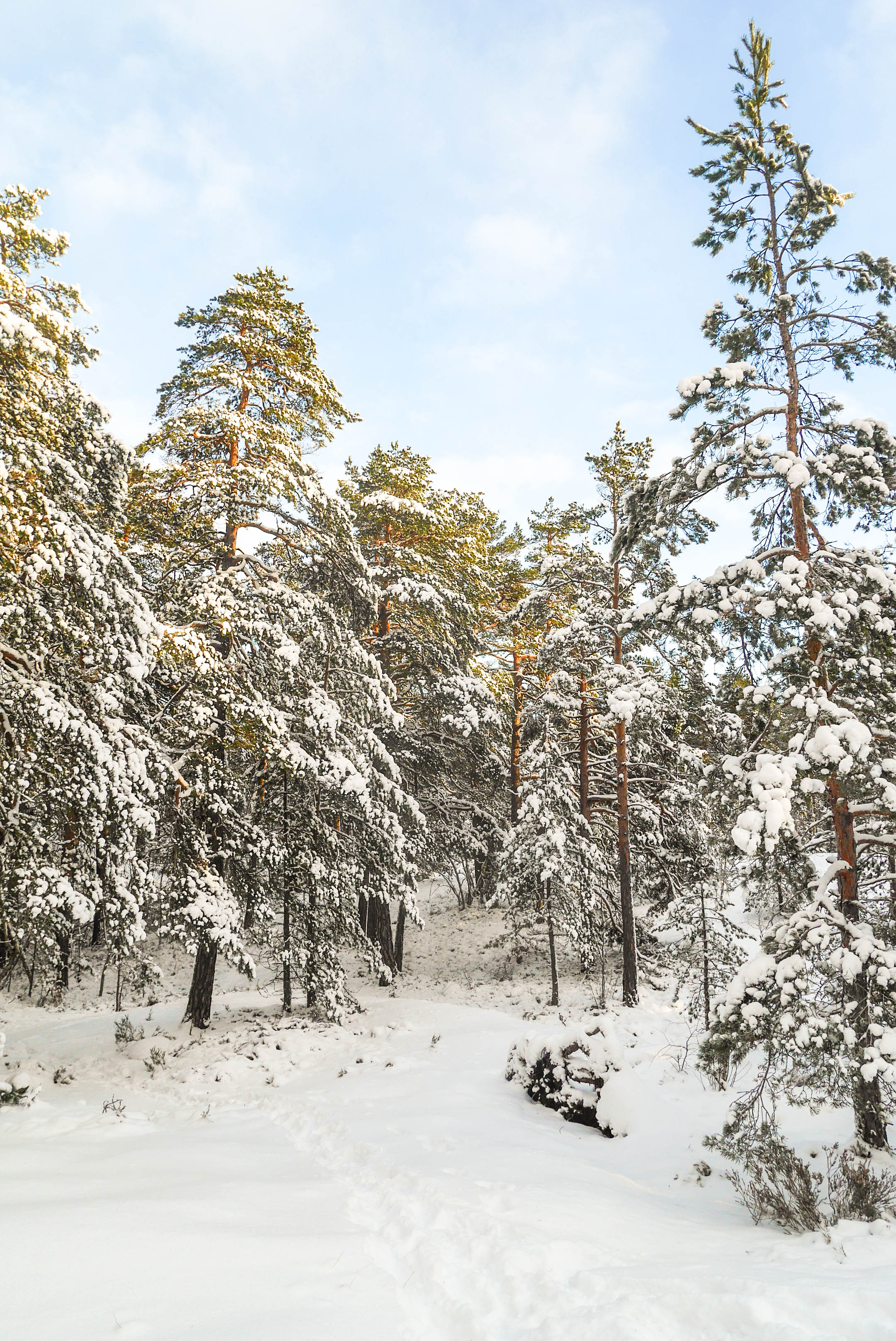 De här bilderna tog jag igår och inatt har det snöat ännu mer så granarna är ännu mer snötunga. Det är helt vidunderligt vackert och ger mig liksom ett sådant lugn. Som att jag vandrar igenom en plats där varelser sover djupt under snötäcket.